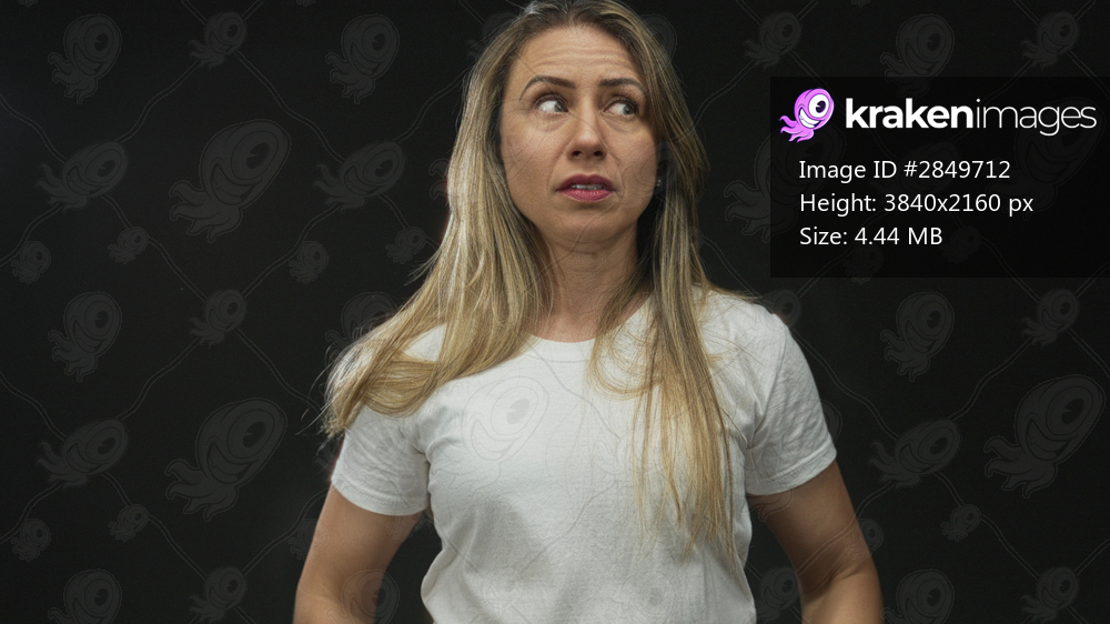 Middle age blonde woman grimaces and rolls eyes upward in black studio portrait; annoyance frustration.