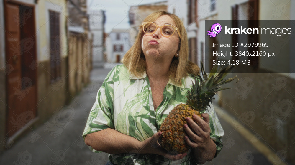 Middle age blonde woman holding pineapple with bare hands, puckering lips toward camera on a narrow sunlit street lined with old buildings; playful vacation joy. - Kraken Images
