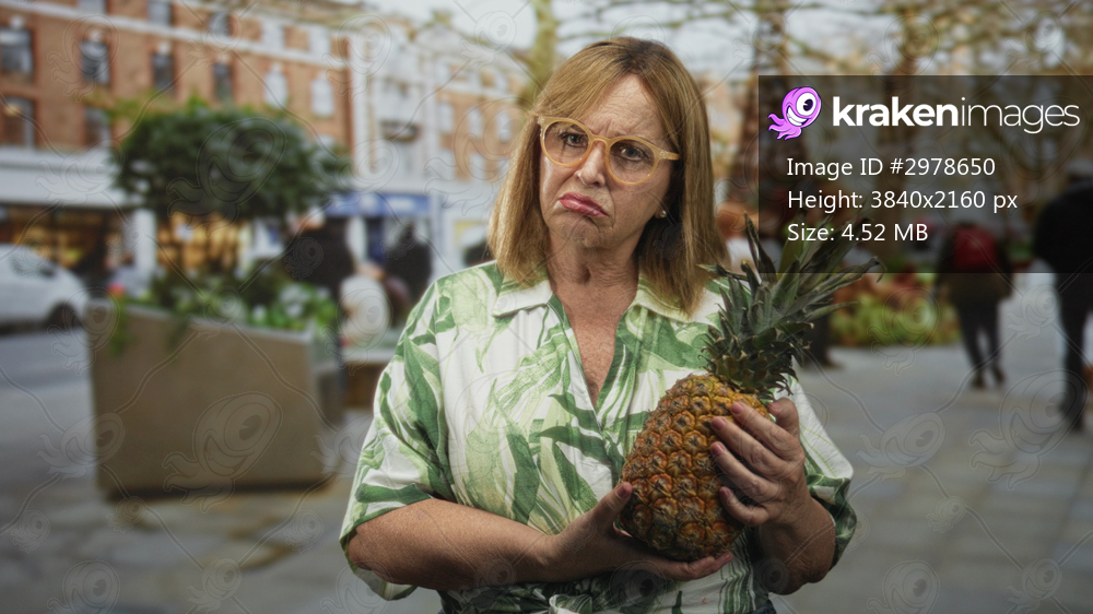 Middle age blonde woman holds pineapple with both hands, mouth open and startled expression on a city street; surprise uncertainty.