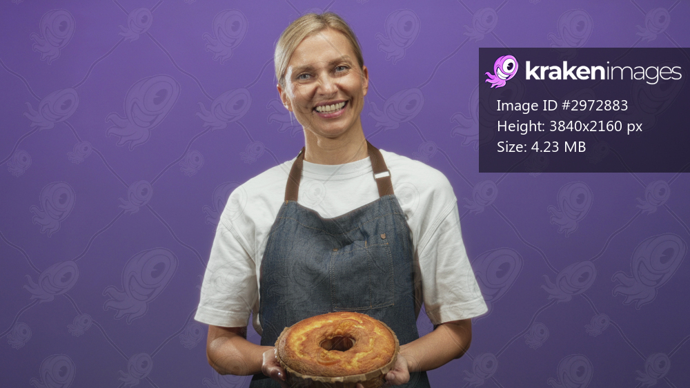 Middle age blonde woman in apron holds sponge cake with both hands at chest level in studio under soft lighting; warm homemade joy.
