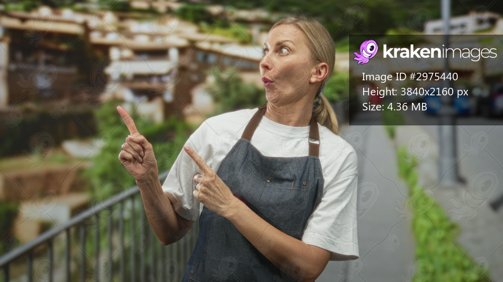 Middle age blonde woman in apron points finger with visible forefinger and surprised puckered lips on street; surprise curiosity.