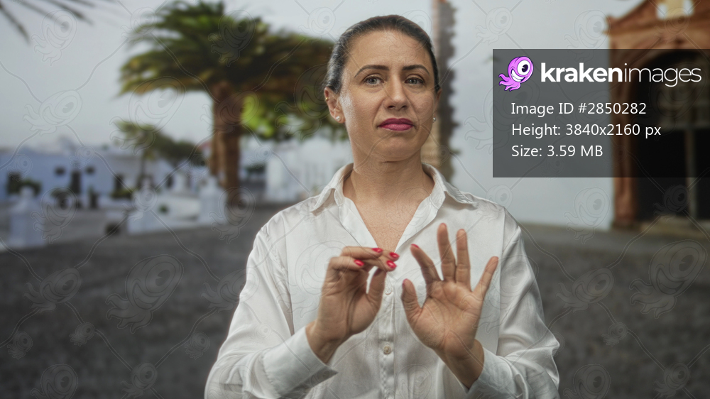 Middle age blonde woman in white shirt holds up both palms in stop gesture on a cobblestone street by a palm tree and building; denial.