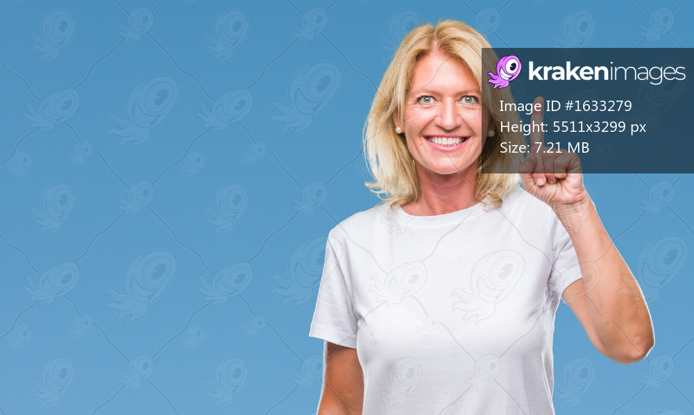 Middle age blonde woman over isolated background showing and pointing up with finger number one while smiling confident and happy.