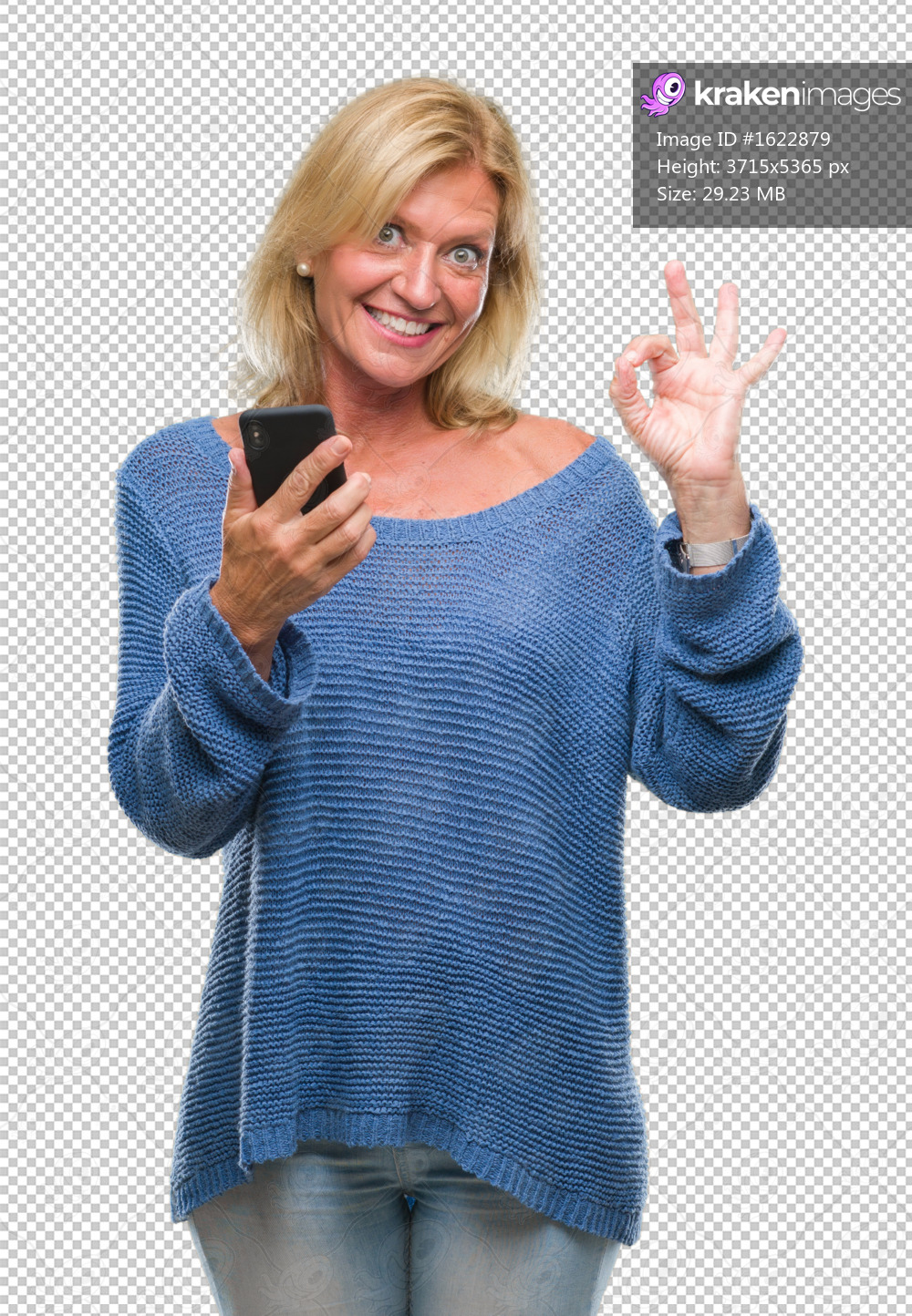 Middle age blonde woman sending message using smartphone over isolated background doing ok sign with fingers, excellent symbol