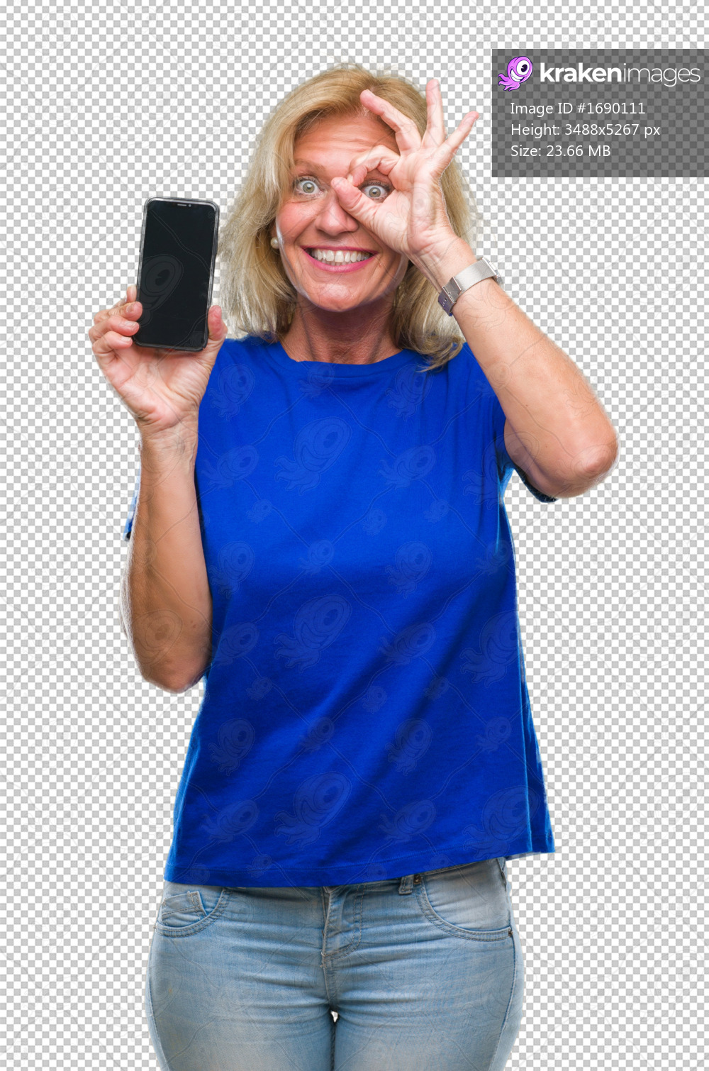 Middle age blonde woman showing blank screen of smartphone over isolated background with happy face smiling doing ok sign with hand on eye looking through fingers - Kraken Images