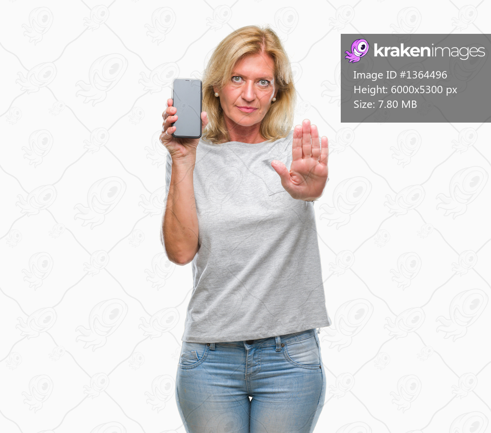 Middle age blonde woman showing blank screen of smartphone over isolated background with open hand doing stop sign with serious and confident expression, defense gesture - Kraken Images