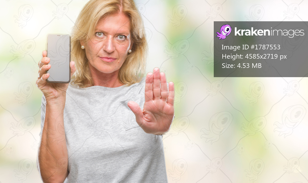 Middle age blonde woman showing blank screen of smartphone over isolated background with open hand doing stop sign with serious and confident expression, defense gesture - Kraken Images