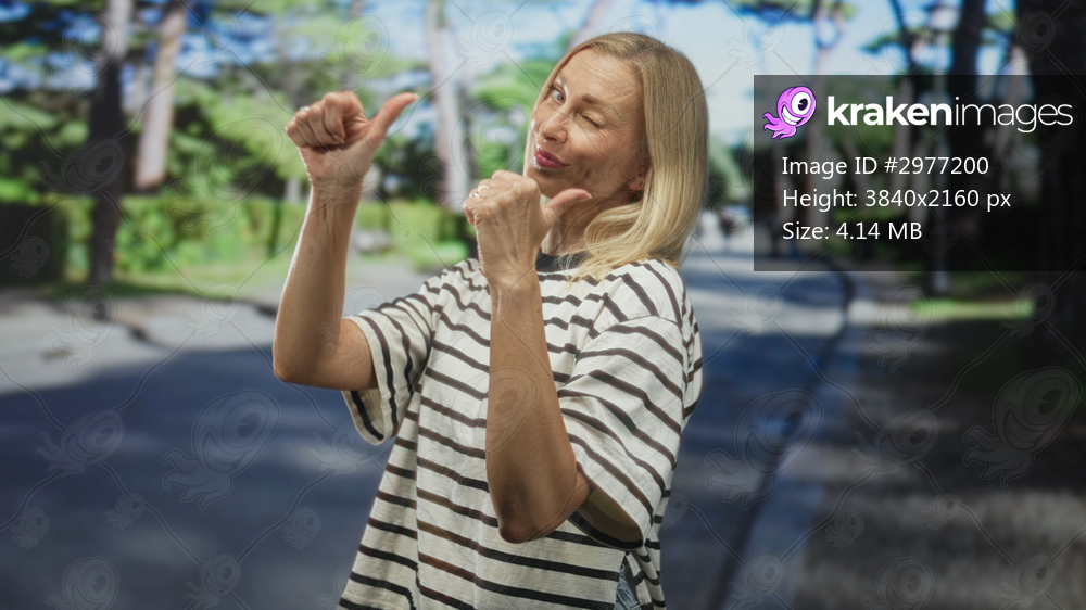 Middle age blonde woman showing thumbs up and beckoning with bare hands on a sunlit tree lined street; playful approval.