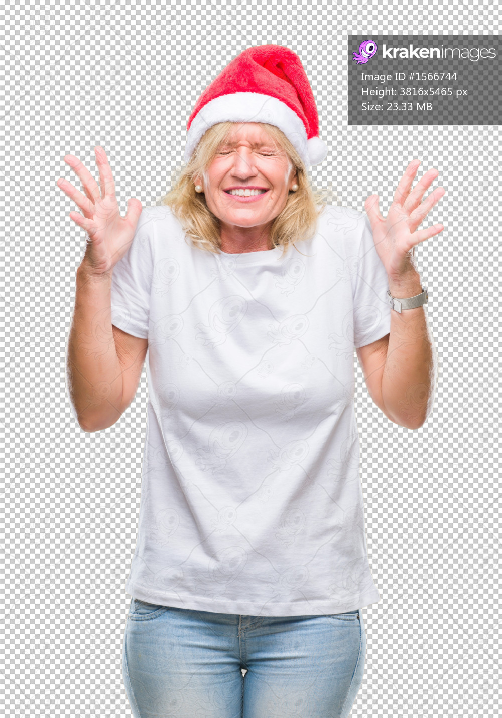 Middle age blonde woman wearing christmas hat over isolated background celebrating mad and crazy for success with arms raised and closed eyes screaming excited. Winner concept - Kraken Images