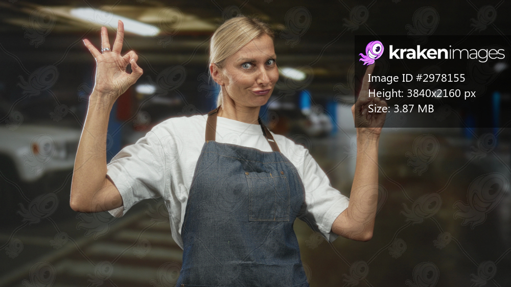 Middle age blonde woman wearing denim apron makes ok sign with left hand and points index finger up with right hand inside a parking building with cars; playful confidence. - Kraken Images
