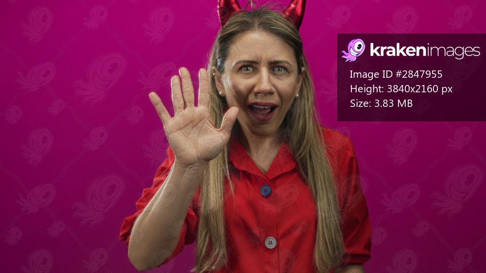 Middle age blonde woman wearing devil horn headband raising palm stop gesture in magenta studio; caution warning safety.