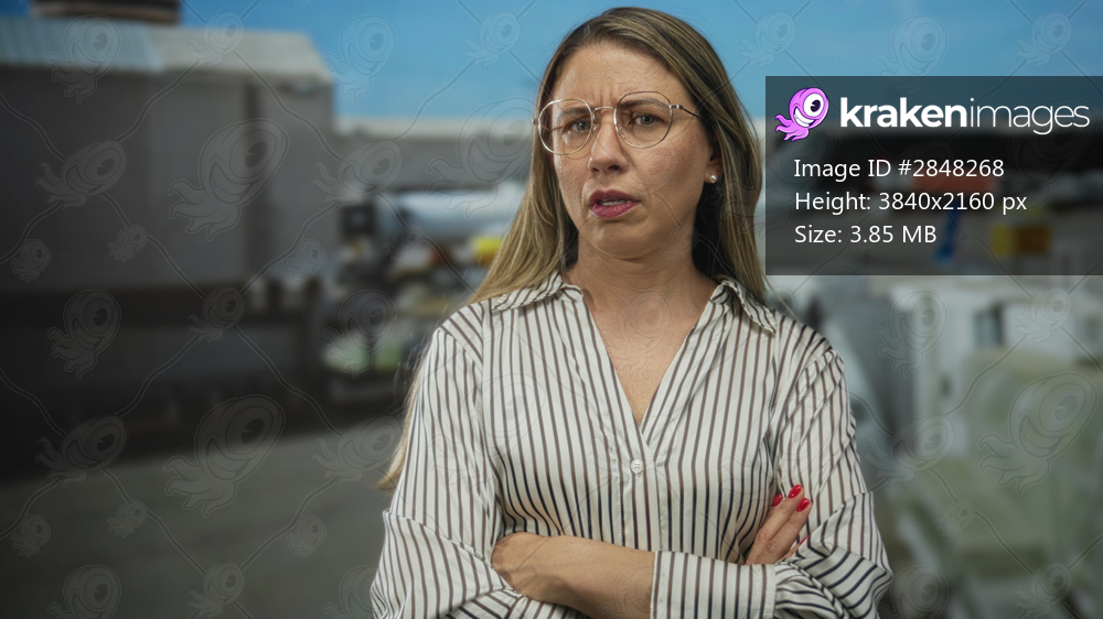 Middle age blonde woman wearing glasses crosses arms in striped shirt outside an airport terminal with a stern gaze; frustration.