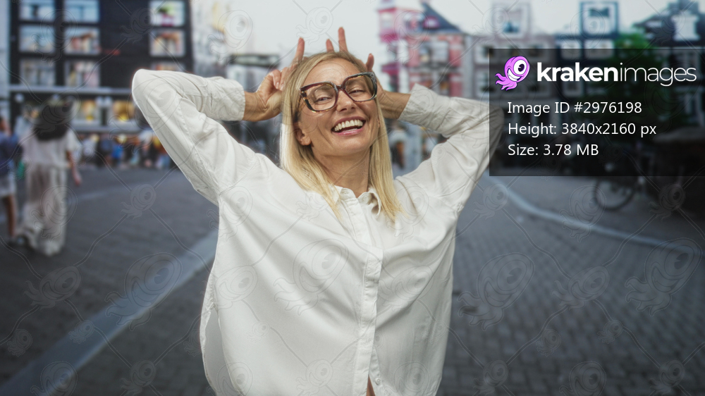 Middle age blonde woman wearing large glasses smiling and making bunny ears with her hands on a cobblestone street; playfulness.