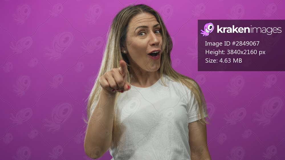 Middle age blonde woman wearing white t shirt pointing finger and giving thumbs up in pink studio; cheerful positivity.