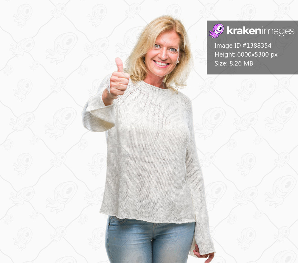 Middle age blonde woman wearing winter sweater isolated background doing happy thumbs up gesture with hand. Approving expression looking at the camera with showing success. - Kraken Images