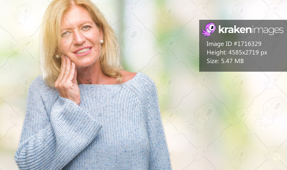 Middle age blonde woman wearing winter sweater over isolated background touching mouth with hand with painful expression because of toothache or dental illness on teeth. Dentist concept. - Kraken Images