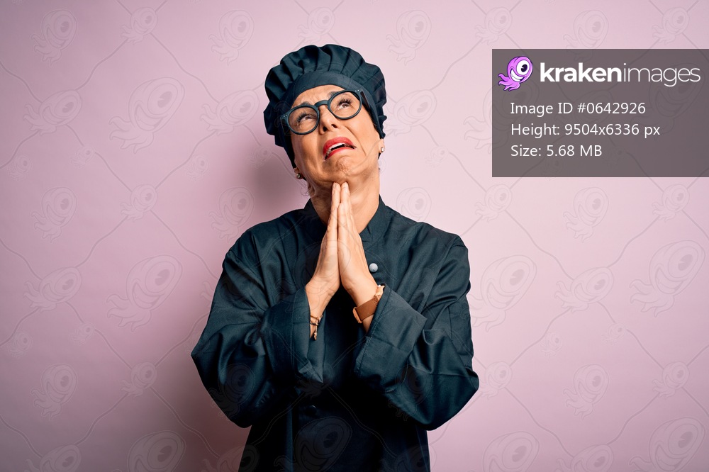 Middle age brunette chef woman wearing cooker uniform and hat over isolated pink background begging and praying with hands together with hope expression on face very emotional and worried. Begging. - Kraken Images