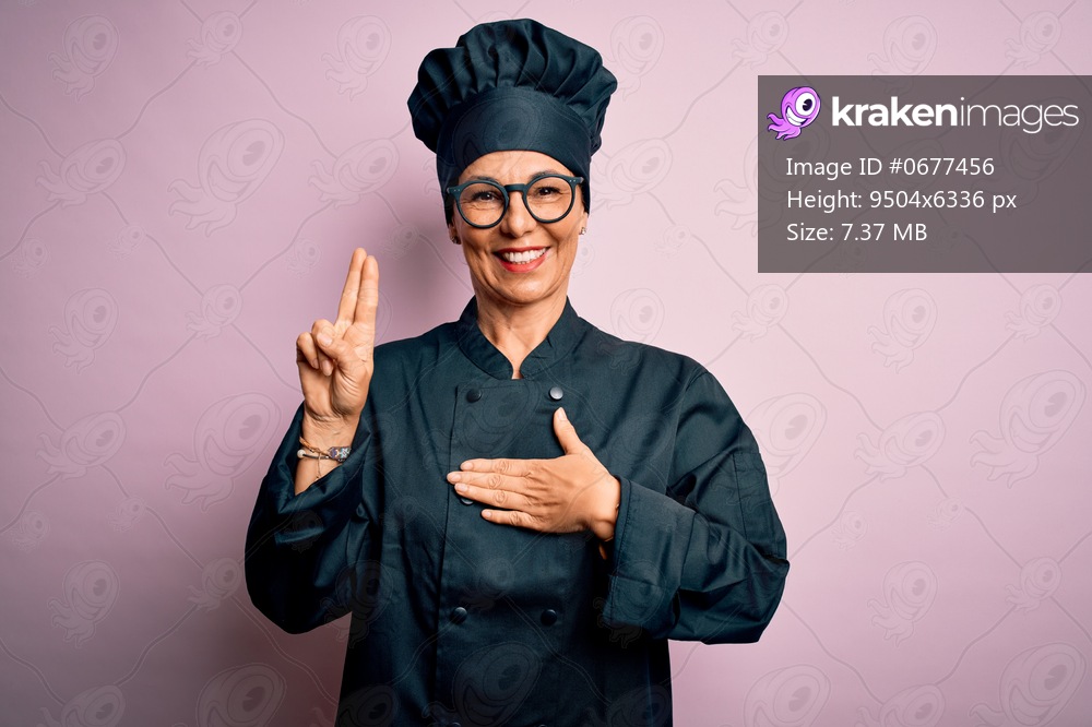 Middle age brunette chef woman wearing cooker uniform and hat over isolated pink background smiling swearing with hand on chest and fingers up, making a loyalty promise oath - Kraken Images
