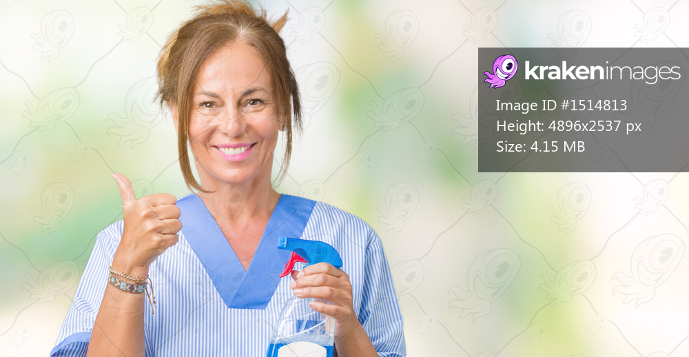 Middle age brunette cleaner woman wearing housework uniform over isolated background pointing and showing with thumb up to the side with happy face smiling - Kraken Images