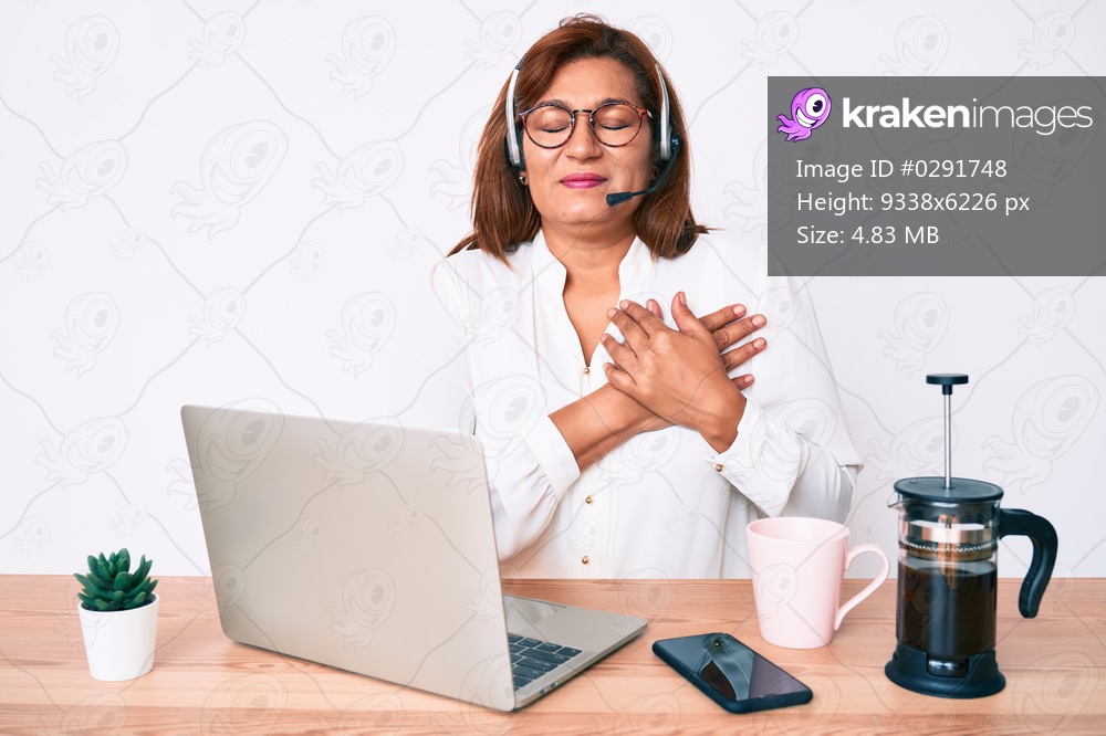 Middle age brunette hispanic woman working at the office wearing operator headset smiling with hands on chest, eyes closed with grateful gesture on face. health concept. - Kraken Images