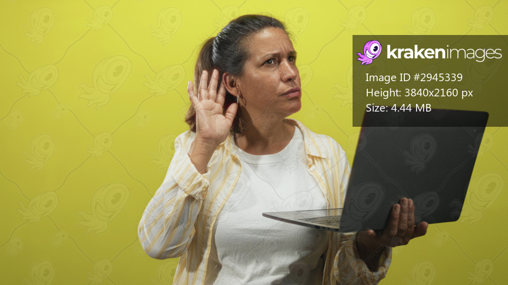 Middle age brunette woman holding a laptop with one hand and cupping her ear with the other while squinting at the screen in studio with yellow backdrop; curiosity. - Kraken Images