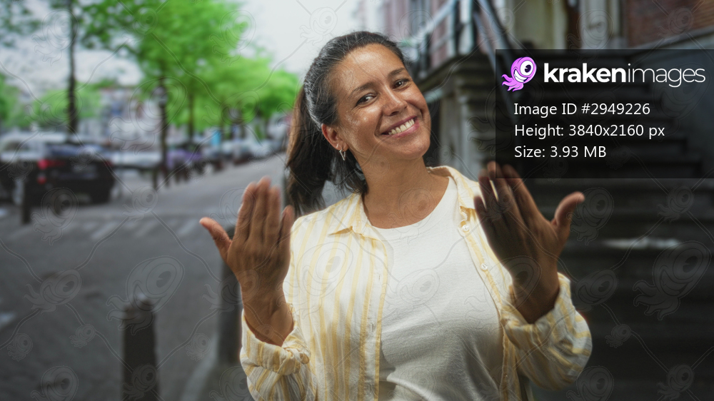 Middle age brunette woman shows hands palms out and smiles toward camera on urban street beside stone steps and parked cars; friendly.