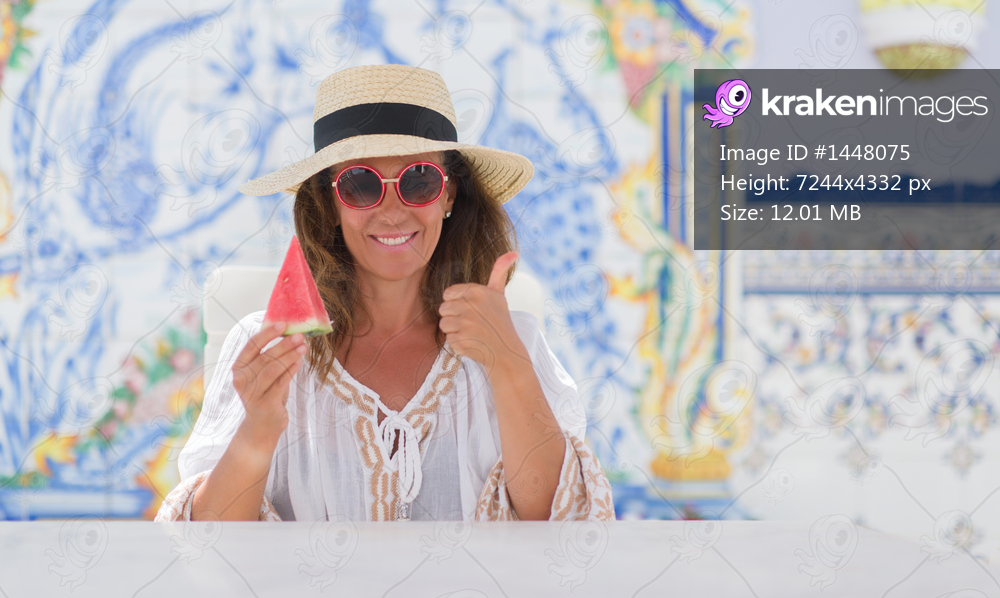 Middle age brunette woman sitting at the table eating watermelon happy with big smile doing ok sign, thumb up with fingers, excellent sign