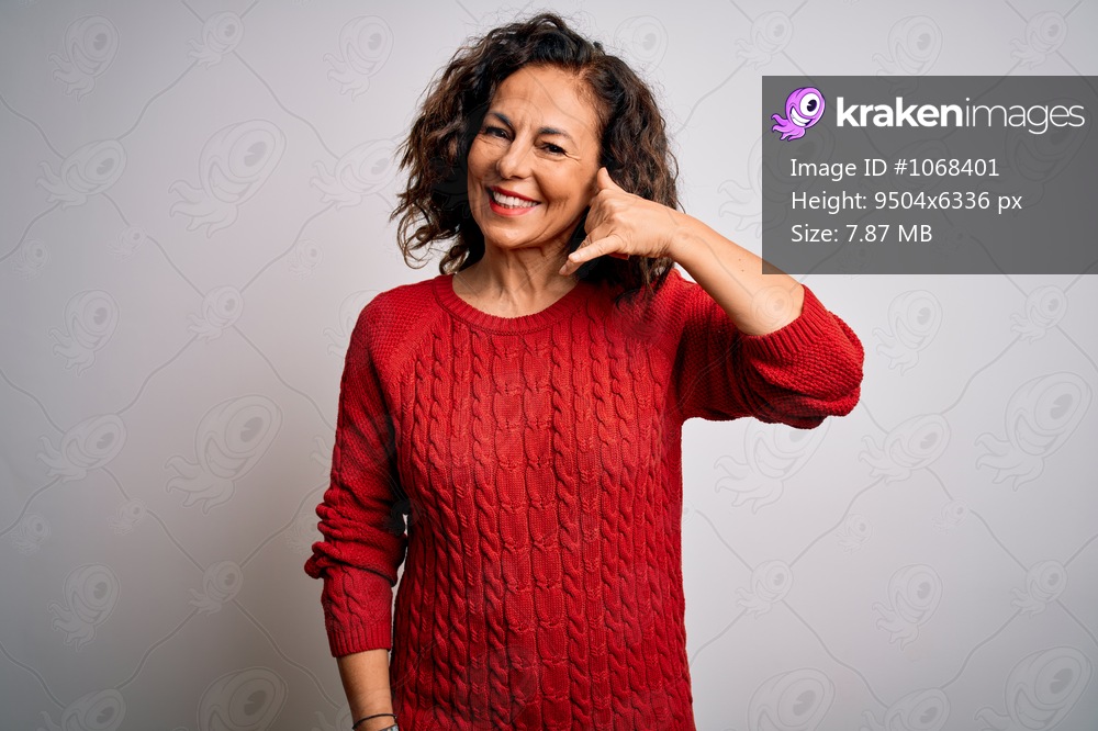 Middle age brunette woman wearing casual sweater standing over isolated white background smiling doing phone gesture with hand and fingers like talking on the telephone. Communicating concepts. - Kraken Images