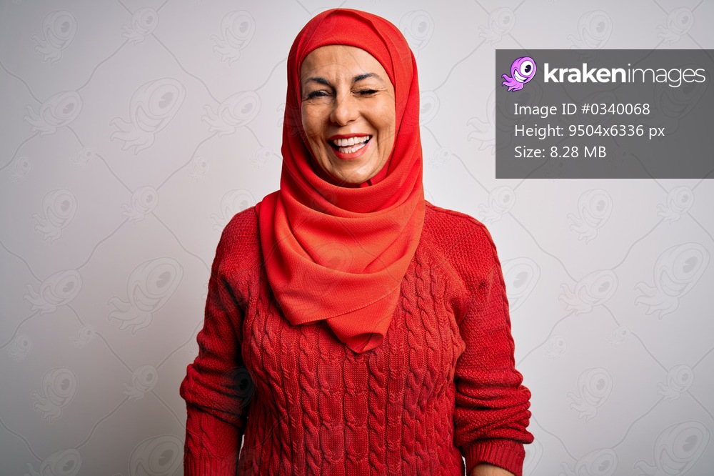 Middle age brunette woman wearing muslim traditional hijab over isolated white background winking looking at the camera with sexy expression, cheerful and happy face. - Kraken Images