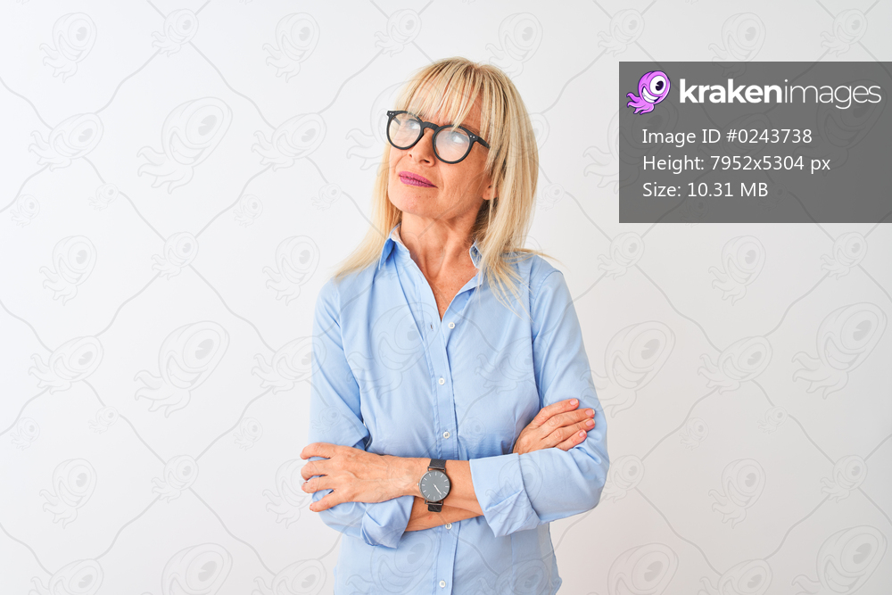 Middle age businesswoman wearing elegant shirt and glasses over isolated white background looking to the side with arms crossed convinced and confident - Kraken Images