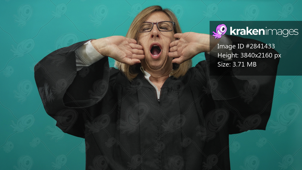 Middle age caucasian judge wearing black robe yawns with raised arms and open mouth against teal studio wall; fatigue.