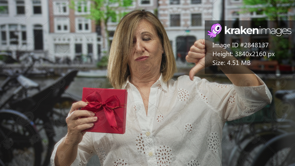 Middle age caucasian woman holding red gift with thumbs down and grimace on busy street; disapproval.