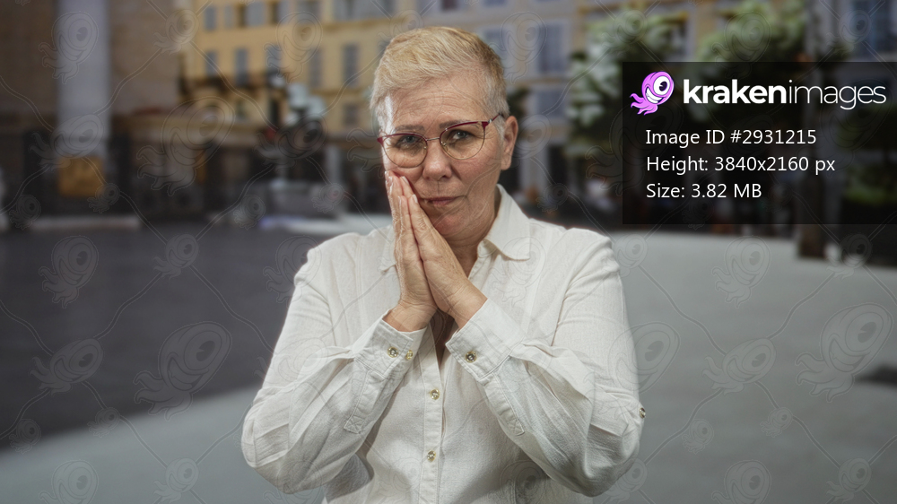 Middle age caucasian woman pressing cheeks with both hands for toothache on a busy street; concern aging vulnerability.