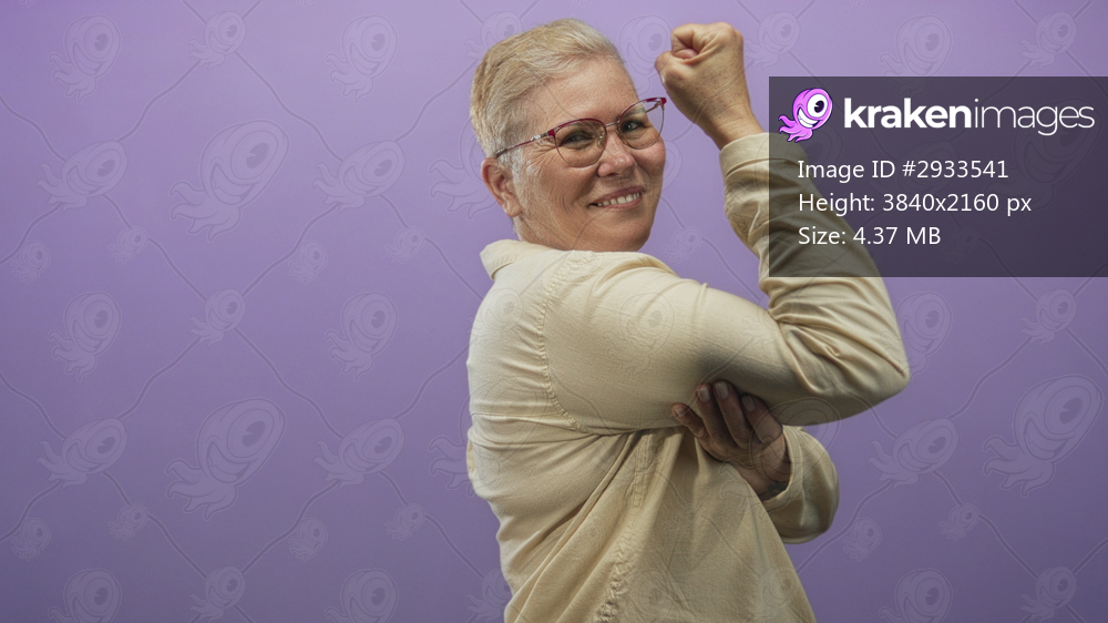 Middle age caucasian woman smiling flexing arm and fist wearing glasses and beige shirt in purple studio; confidence empowerment.