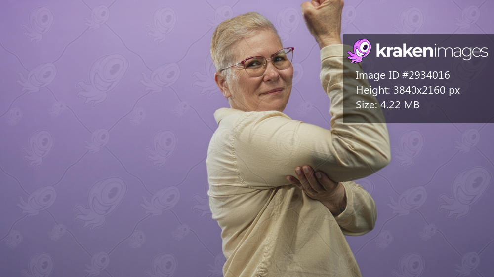 Middle age caucasian woman smiling flexing arm and fist wearing glasses and beige shirt in purple studio; confidence empowerment.