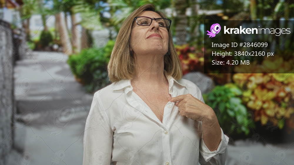 Middle age caucasian woman wearing glasses smirks and points finger to chest on green forest path; confidence.