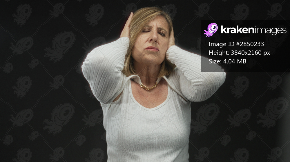Middle age caucasian woman wearing gold necklace covers ears in studio with black background; silence distress.