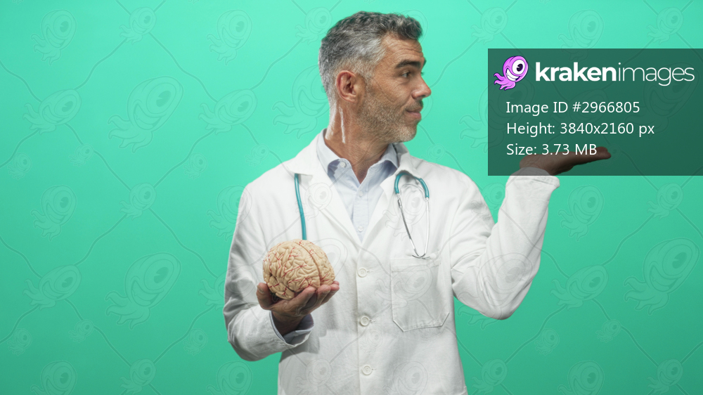 Middle age doctor man holding a brain model in left hand while right palm faces up in studio; education confidence insight.