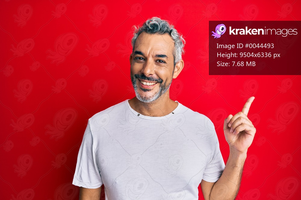 Middle age grey-haired man wearing casual white tshirt smiling happy pointing with hand and finger to the side
