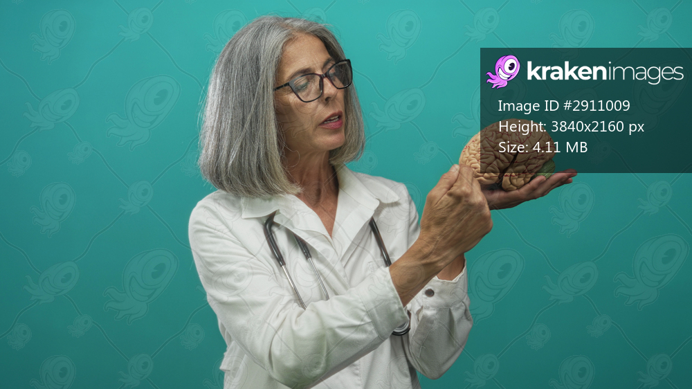 Middle age grey haired woman doctor with stethoscope points finger to brain model in teal studio; serious education awareness.