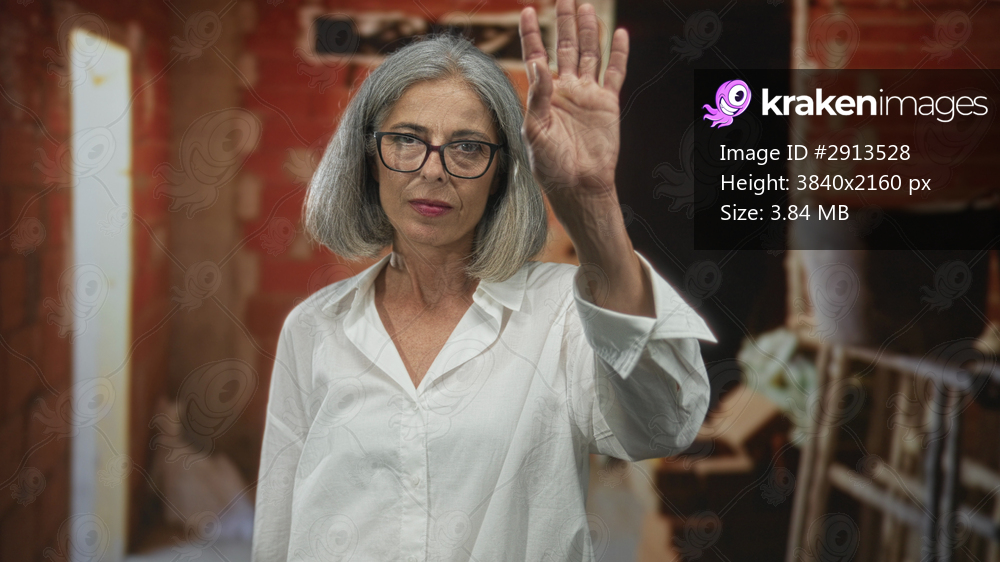 Middle age grey haired woman wearing glasses with right hand raised palm out signaling stop inside a brick building under construction; determination.