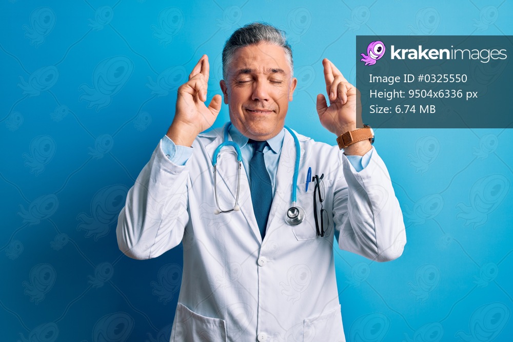 Middle age handsome grey-haired doctor man wearing coat and blue stethoscope gesturing finger crossed smiling with hope and eyes closed. Luck and superstitious concept. - Kraken Images