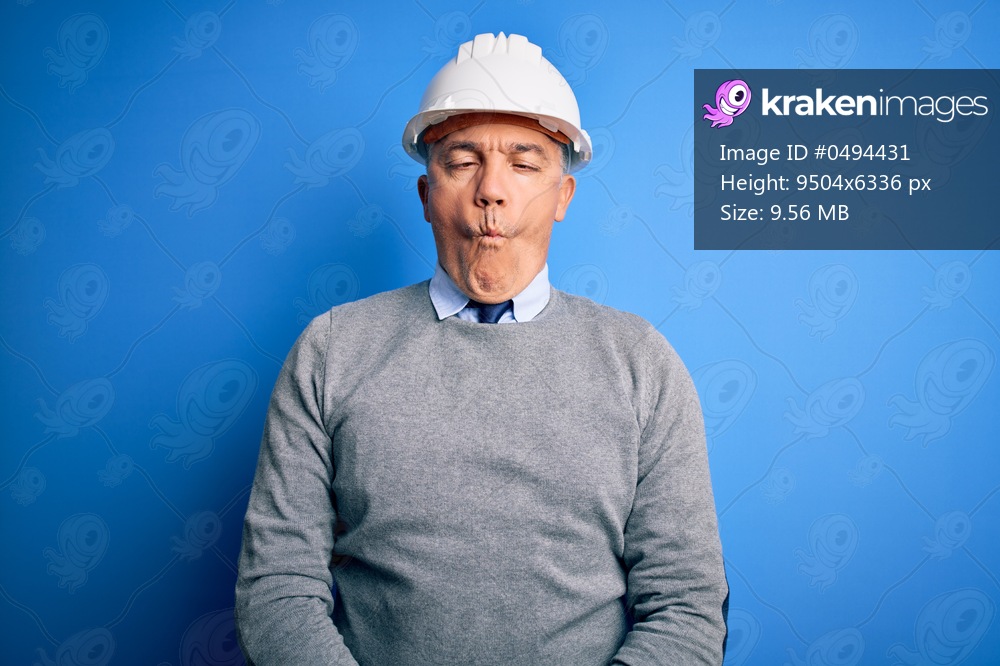 Middle age handsome grey-haired engineer man wearing safety helmet over blue background making fish face with lips, crazy and comical gesture. Funny expression. - Kraken Images