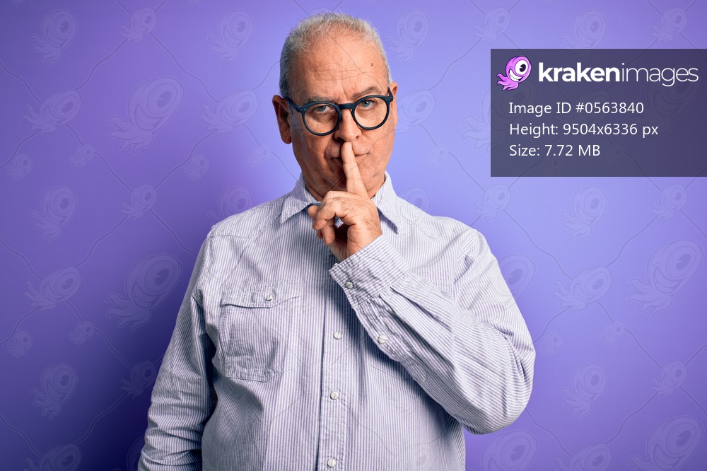 Middle age handsome hoary man wearing striped shirt and glasses over purple background asking to be quiet with finger on lips. Silence and secret concept. - Kraken Images