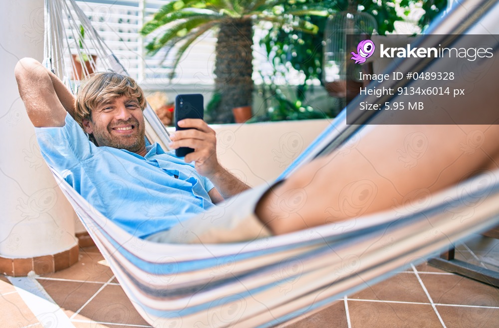 Middle age handsome man at the terrace of his house relaxing lying on a hammock with the phone
