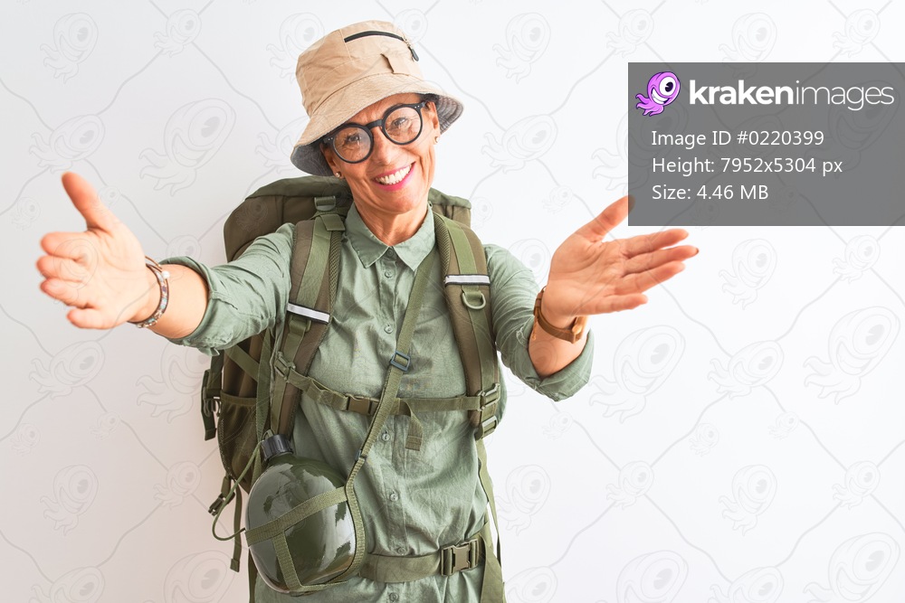 Middle age hiker woman wearing backpack canteen hat glasses over isolated white background looking at the camera smiling with open arms for hug. Cheerful expression embracing happiness. - Kraken Images