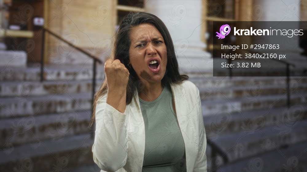 Middle age hispanic brunette woman clenches fist and scowls at the stone steps and entrance of a public building; anger defiance.