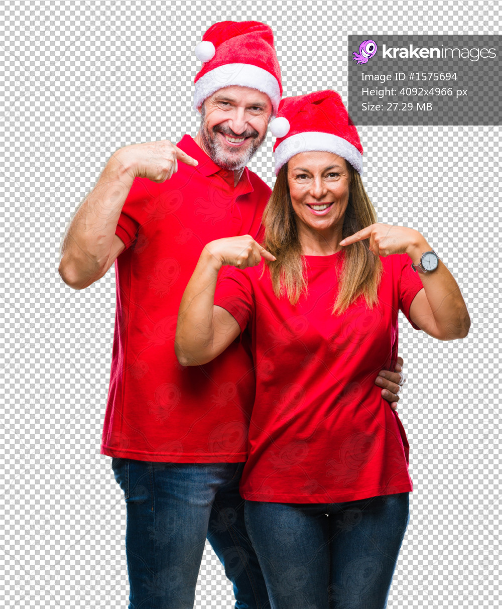 Middle age hispanic couple wearing christmas hat over isolated background looking confident with smile on face, pointing oneself with fingers proud and happy. - Kraken Images