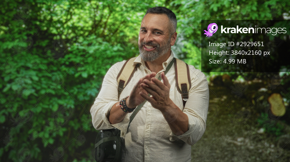 Middle age hispanic man clapping hands in forest with backpack and canteen, smiling toward camera on leafy trail; joy adventure.