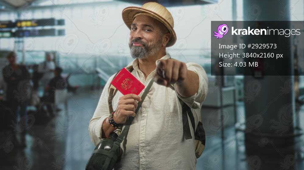 Middle age hispanic man with grey beard and straw hat holding red passport and pointing finger toward camera in airport terminal; travel confidence.